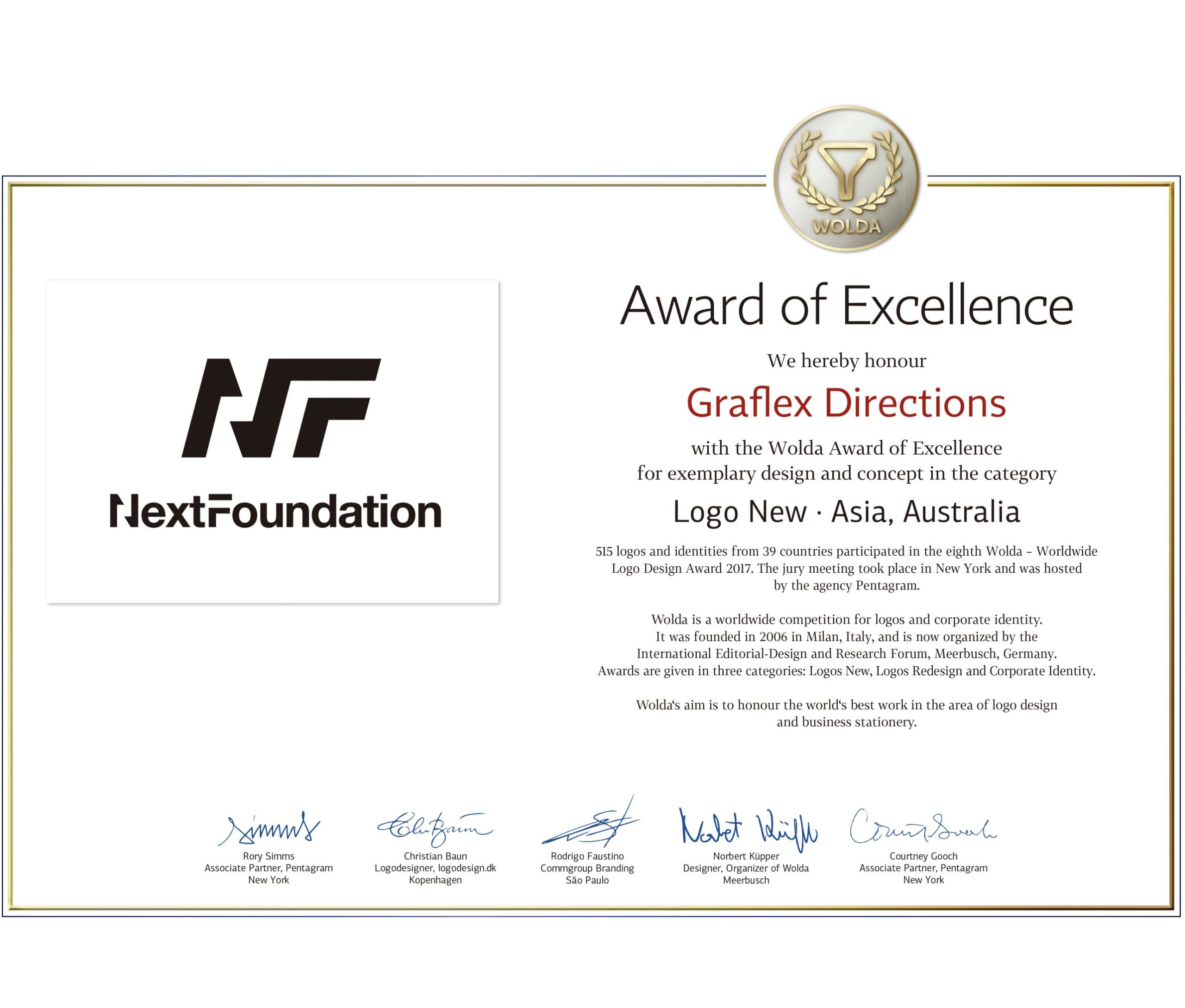 8th WOLDA(Worldwide Logo Design Annual)において、Award of Excellence受賞しました。