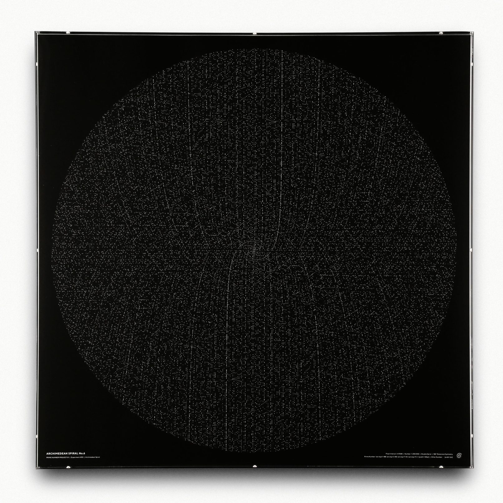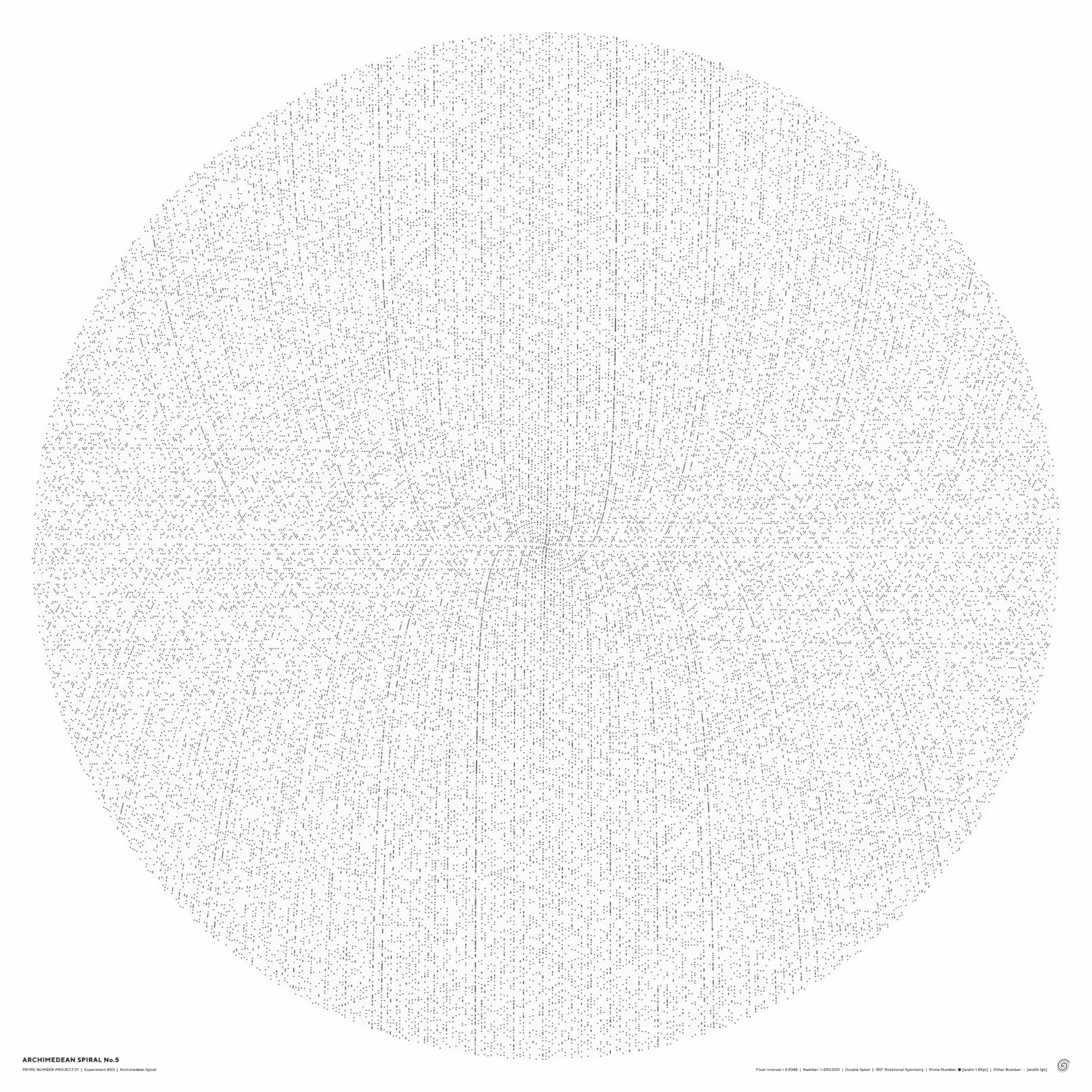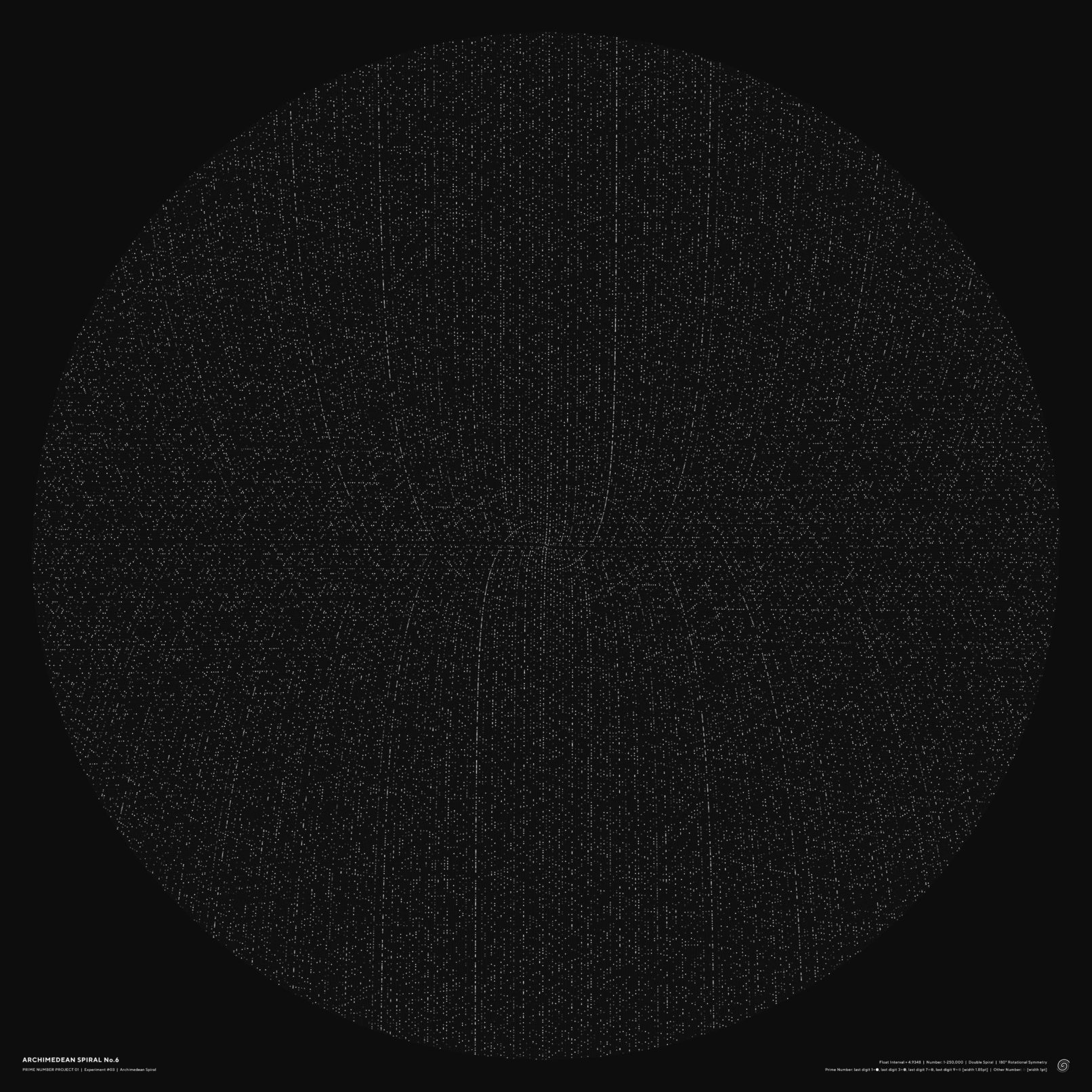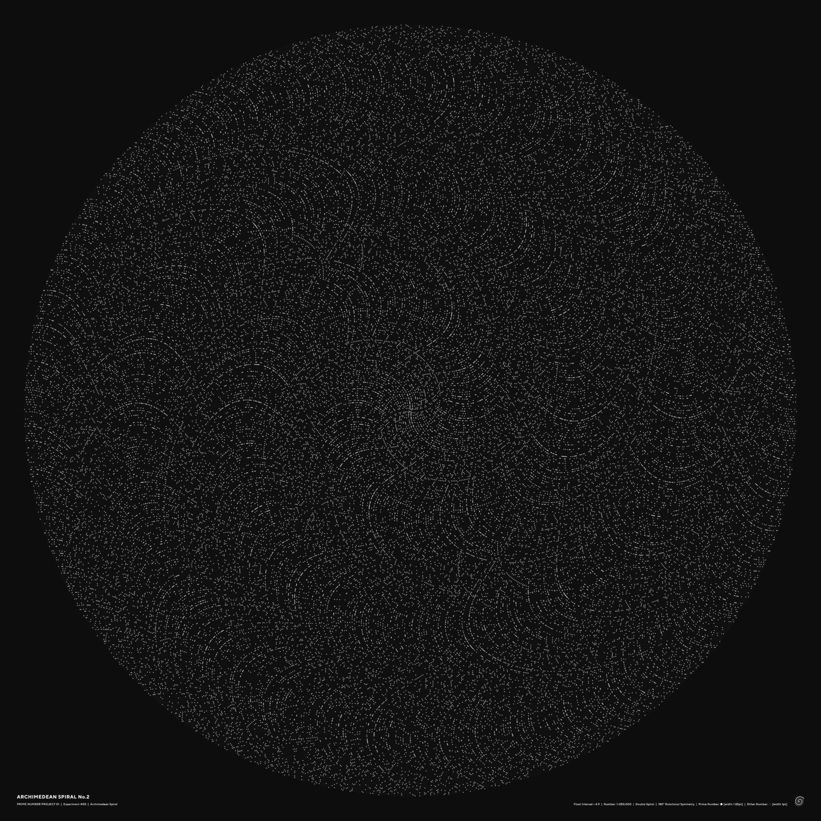作品ポスターは1〜250,000までの螺旋を作成し、コピーした上で1を起点として180°回転し、二重螺旋にした(下図)。 点同士の間隔の数値を3にした場合は、無秩序な靄のような点の集合となり(No.1)、 それを4.9にするとスズメ蜂の巣のようなパターンに変化する(No.2)。 4.925にすると、見る場所によっては多次元を構成するような不思議な空間が見えてくる(No.3)。 さらに探っていき、4.9348という数値を入力してみたところ、天地左右に外に向かっていく直線が現れた(No.4)。 螺旋状に配置しているだけなのに、垂直、水平に向かっていく線がはっきりと現れる。 試しに100万まで書き出しても、この特徴は続いていくことがわかった。