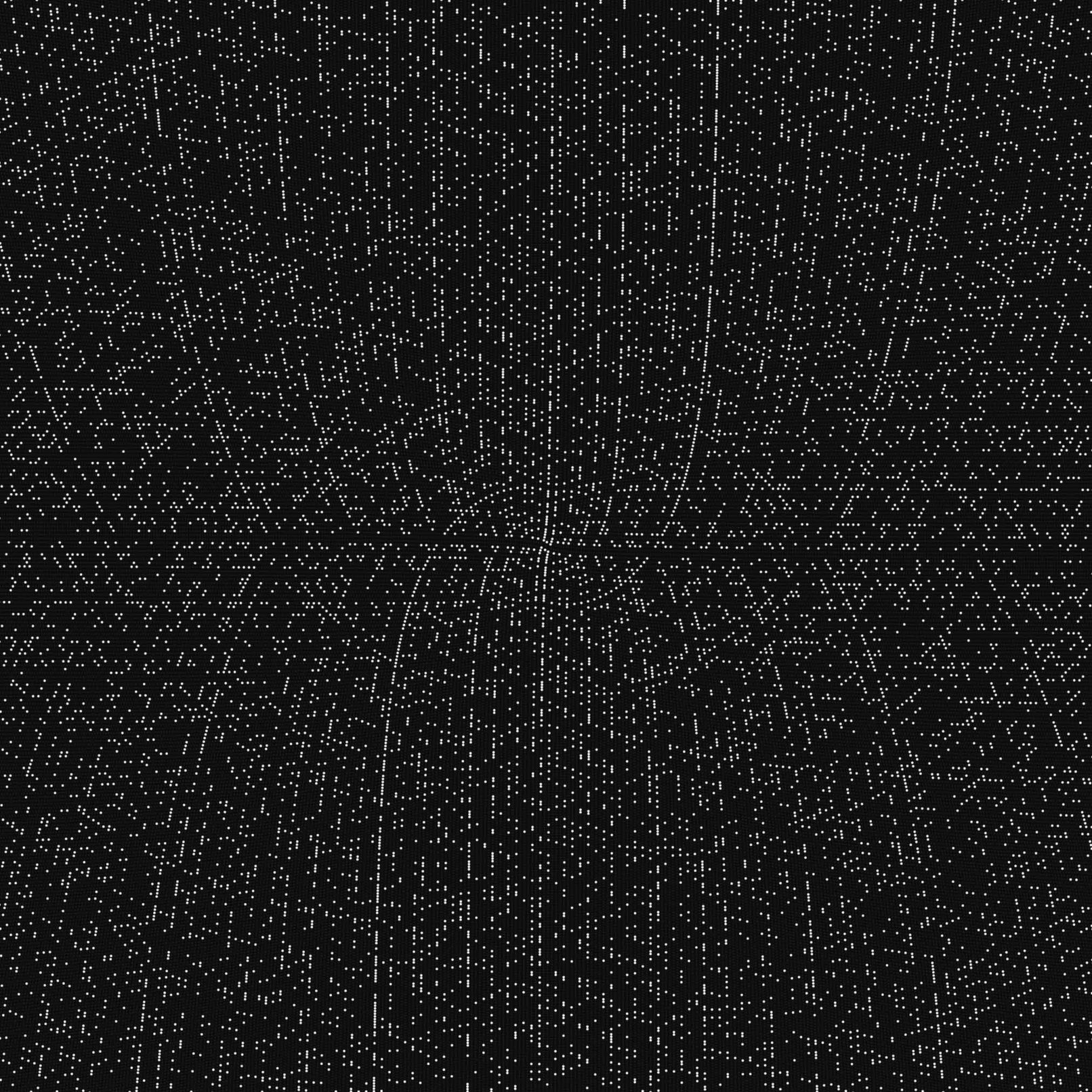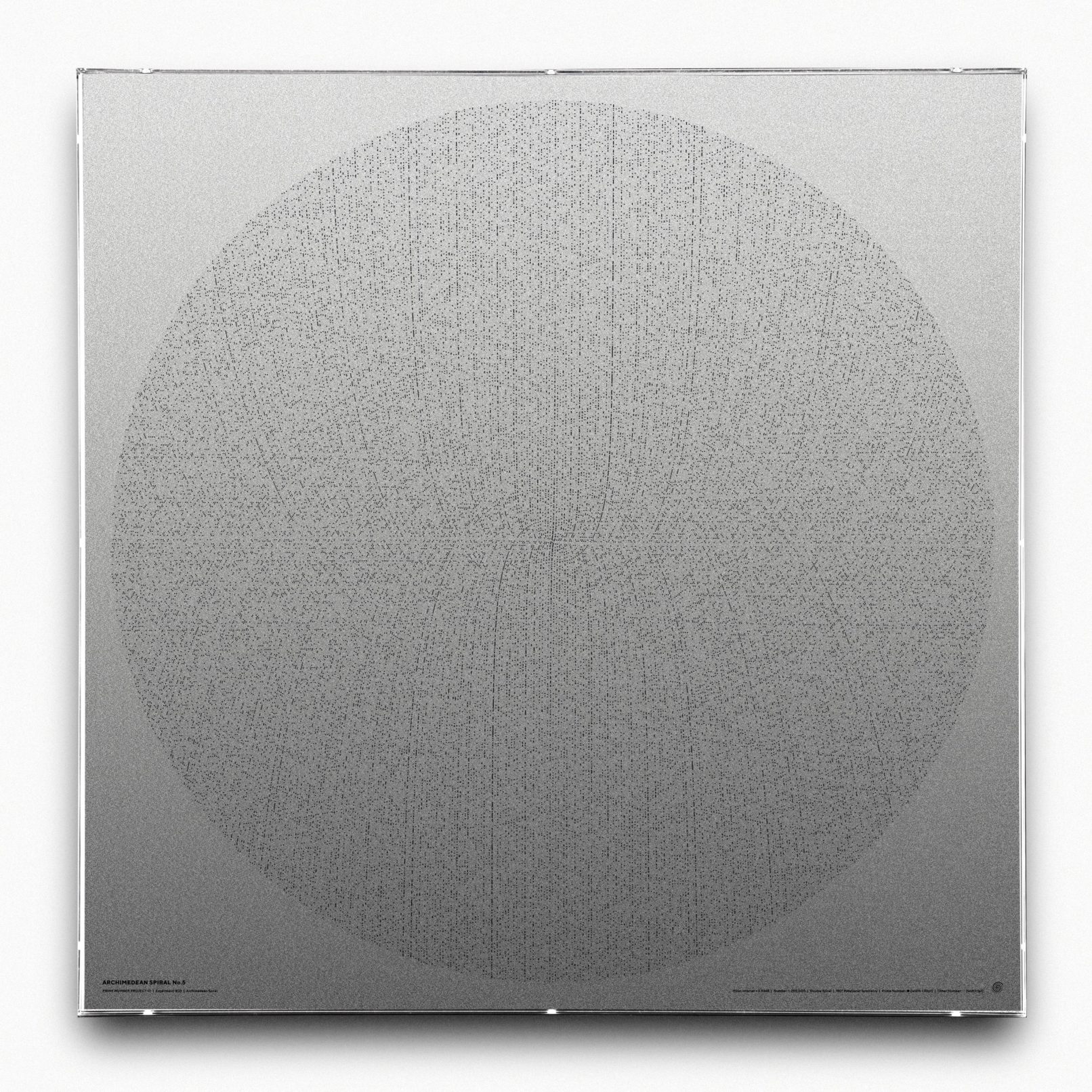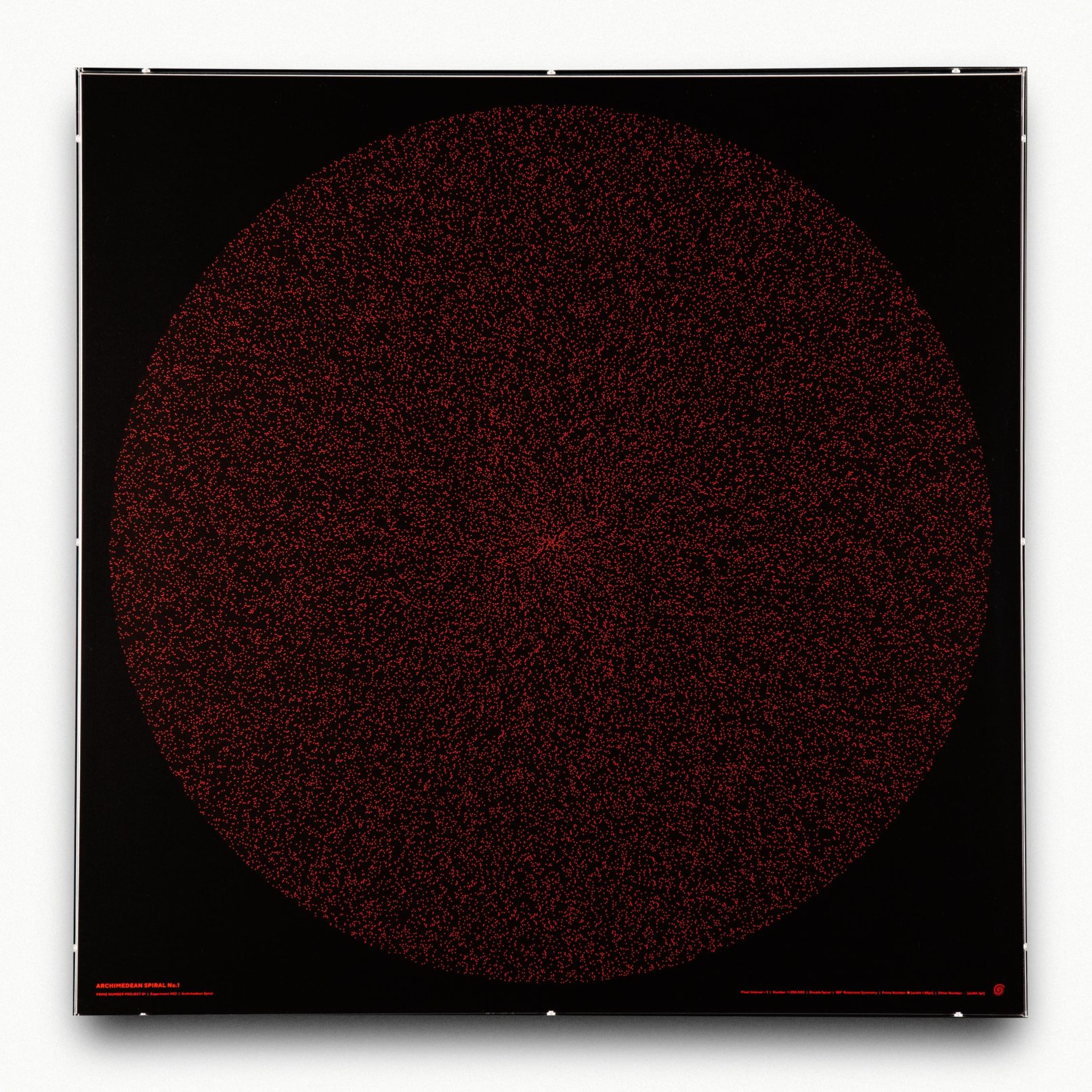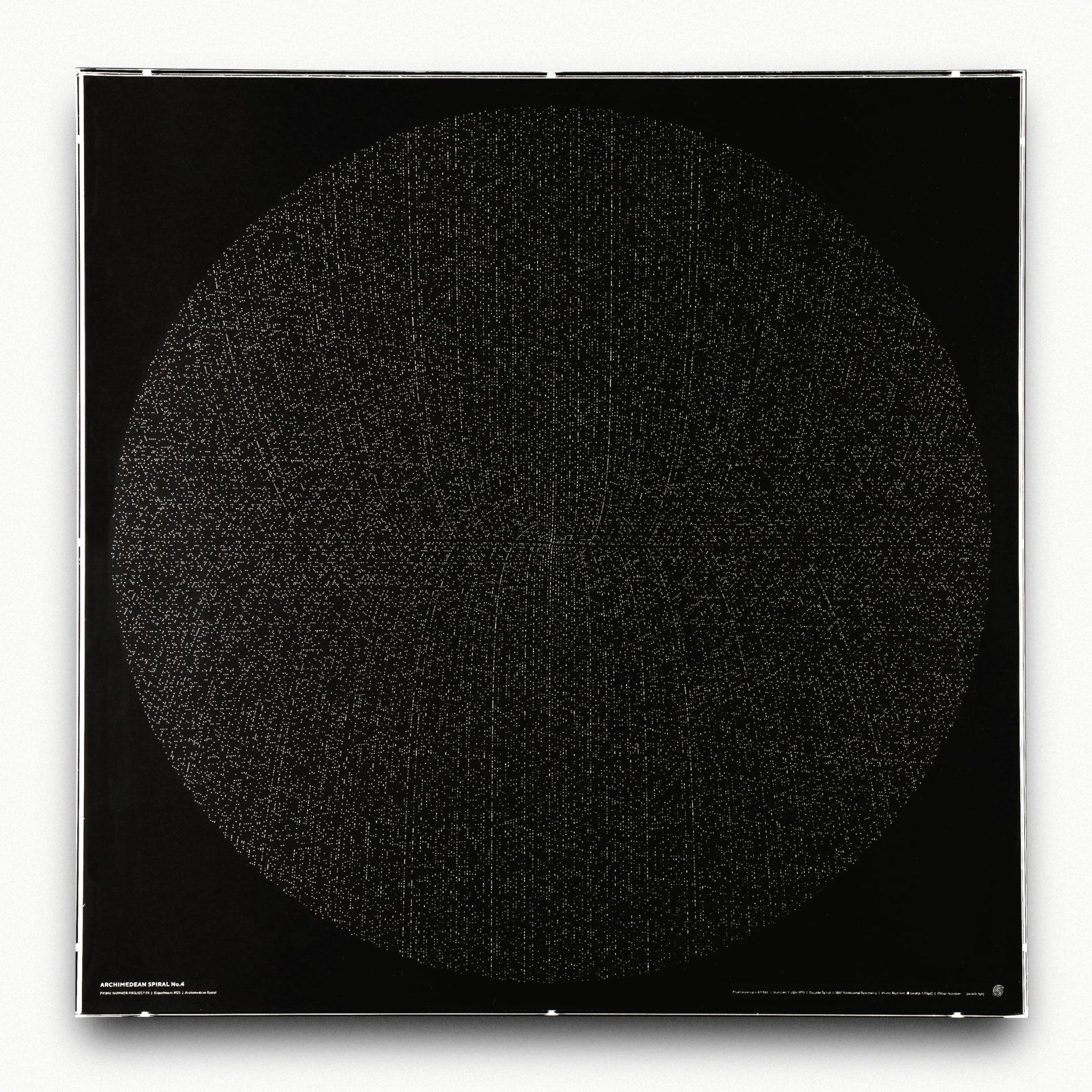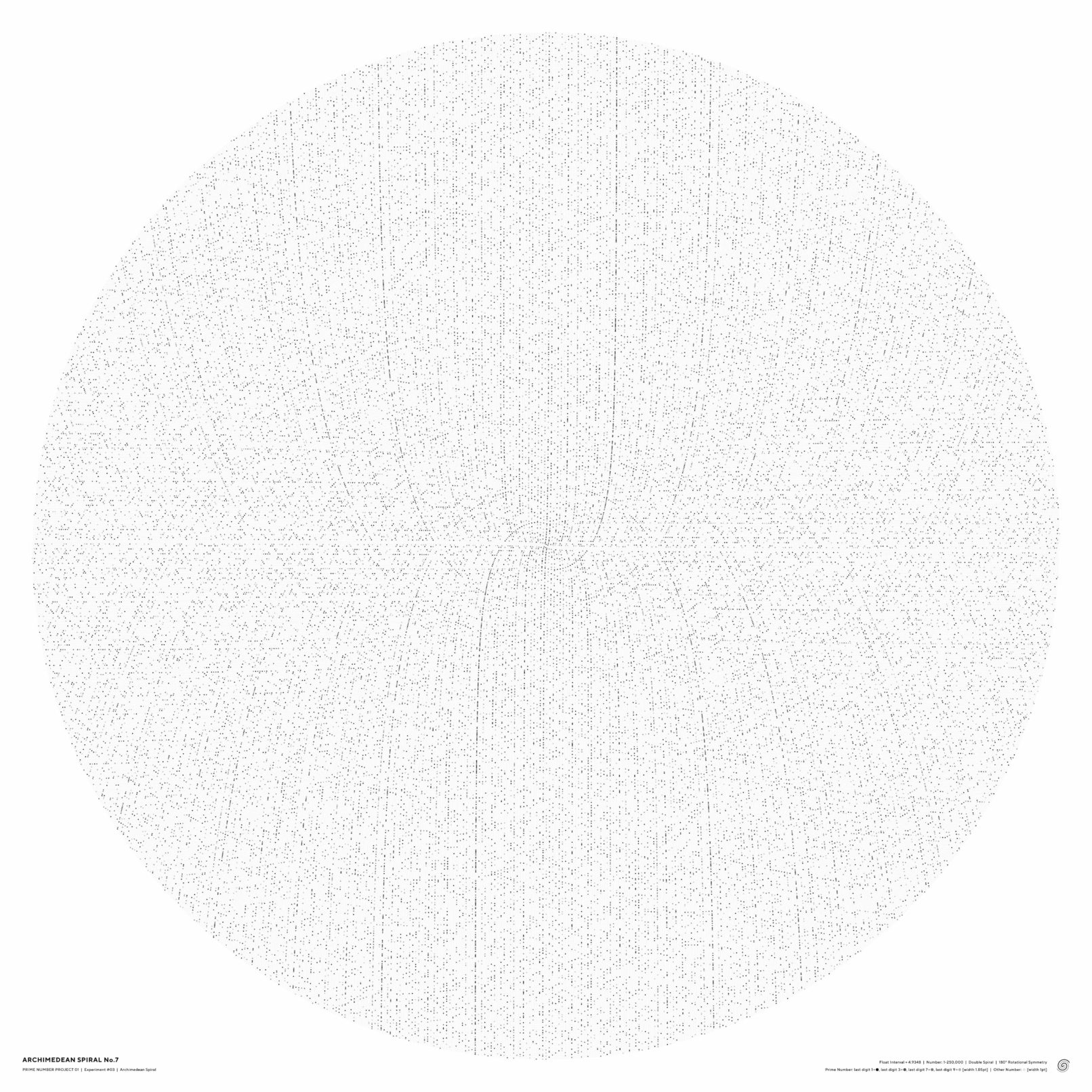 作品ポスターは1〜250,000までの螺旋を作成し、コピーした上で1を起点として180°回転し、二重螺旋にした(下図)。 点同士の間隔の数値を3にした場合は、無秩序な靄のような点の集合となり(No.1)、 それを4.9にするとスズメ蜂の巣のようなパターンに変化する(No.2)。 4.925にすると、見る場所によっては多次元を構成するような不思議な空間が見えてくる(No.3)。 さらに探っていき、4.9348という数値を入力してみたところ、天地左右に外に向かっていく直線が現れた(No.4)。 螺旋状に配置しているだけなのに、垂直、水平に向かっていく線がはっきりと現れる。 試しに100万まで書き出しても、この特徴は続いていくことがわかった。