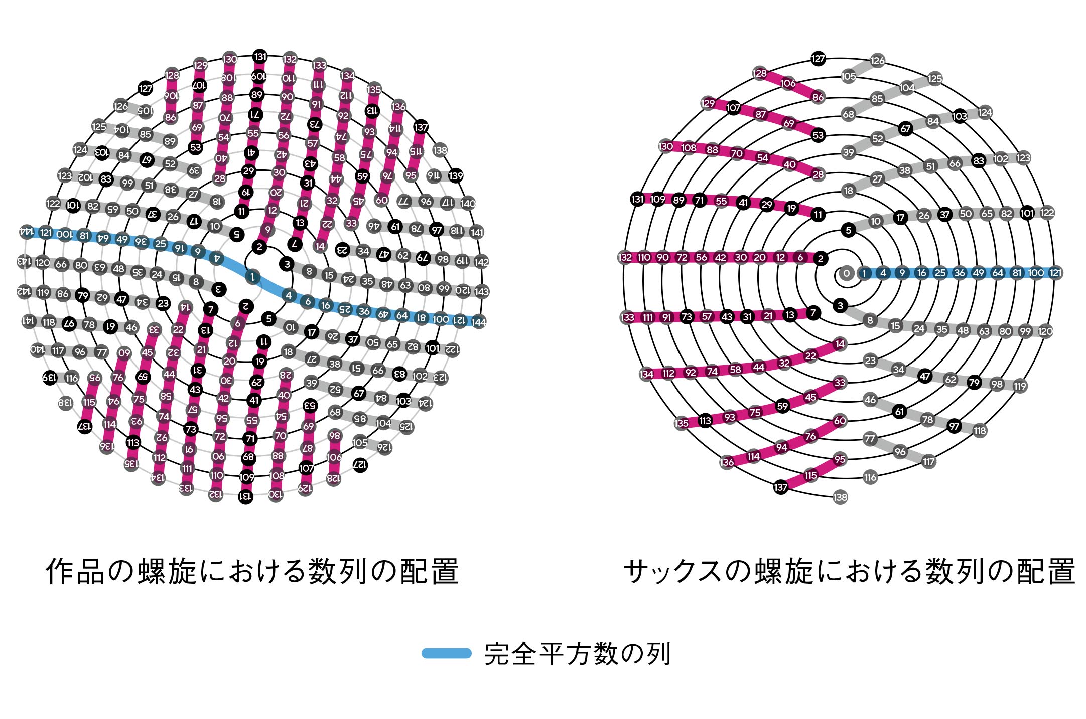 しかし、1994年に数学者のロバート・サックス氏が発見した「サックスの螺旋」によく似ている。 調べてみると、サックスの螺旋は周回ごとに直線状に完全平方数が配置されるが、 今回私が書き出したパターンは完全平方数が半周ごとに左右に直線状に配置されていることがわかった。 それを回転して二重螺旋にしているので、完全平方数の配置自体はサックスの螺旋と偶然にも一致したことになる。 異なる点としては、始点が0でなく1であることと、二重螺旋構造なので同じ数字を2回使っていること、 また、完全平方数の配置が片方ではなく左右に存在すること、さらに 数字の並び方は共通するが下図のように数列の流れる方向が異なることである。