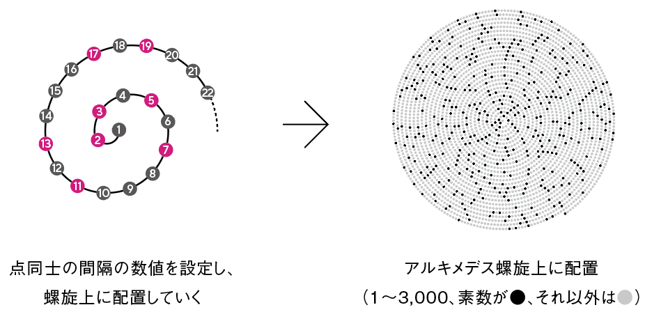 アルキメデス螺旋上に、記号化した素数と自然数を配置するプログラムを設定し(下左図)、 間隔を変えながら見えてくる表情を探った。 3,000まで配置したものが下右図である。部分的に、点の並びが線のように見えてくる。